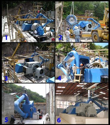 The upper left photo shows the inside of a relatively small hydro powerhouse. The silver pipe attaching to the blue turbine provides the water from the diversion upstream. The shaft from the turbine connects to the generator on the left (also blue).