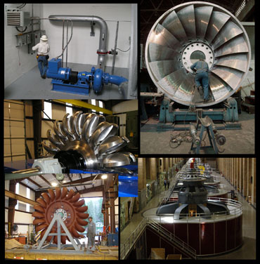 The top right photo shows a very large Francis-type turbine runner, typically used in large reservoir (dam) hydroelectric systems.