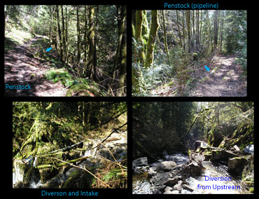The top two photos show the pipeline (arrows), bearing a close resemblance to the logs around it. The bottom photos show the diversion and pipeline intake. Notice only a small portion of the stream's water is used.
