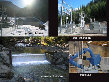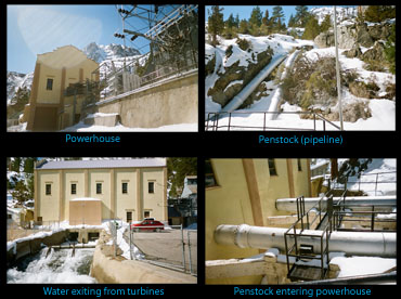 The system produces about 5,400 Kw of electricity and connects directly to the grid. The photos show the powerhouse, which houses the turbine and generator. Also shown is the intake system, where a portion of the water is diverted into a pipeline (not shown) that runs down the hill to the powerhouse. The substation provides the connection to the electrical grid.