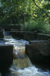 A typical diversion system for a Streaming hydropower plant. A short spillway ensures an upward path for fish migration.