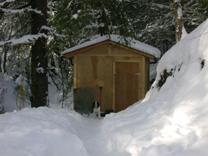 A "backyard" hydroelectric system. This structure contains a hydropower turbine and generator capable of running one or more homes.